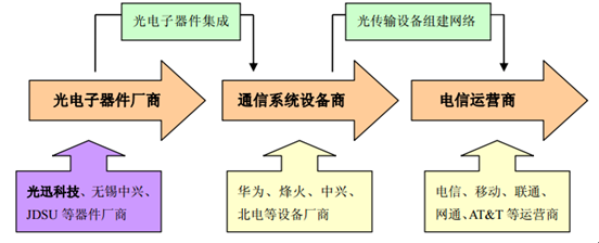 在光纤通信的产业链上,光电子器件生产处于产业链的上游,光电子器件行业的下游主要是通信系统设备行业,光电子器件产品由通信系统设备厂商系统集成为光传输设备,然后再由通信系统设备厂商提供给电信运营商,由电信运营商构建完整的通信网络后向消费者提供各种电信服务。