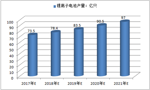 2015年,中国锂离子电池产量为56.0亿只,同比增长3.1%。;2016年1-9月,产量达到52.4亿只,同比增长32.8%。预计2017年中国锂离子电池产量将达到73.5亿只,未来五年(2017-2021)年均复合增长率约为7.17%,2021年中国锂离子电池产量将达到97.0亿只。
